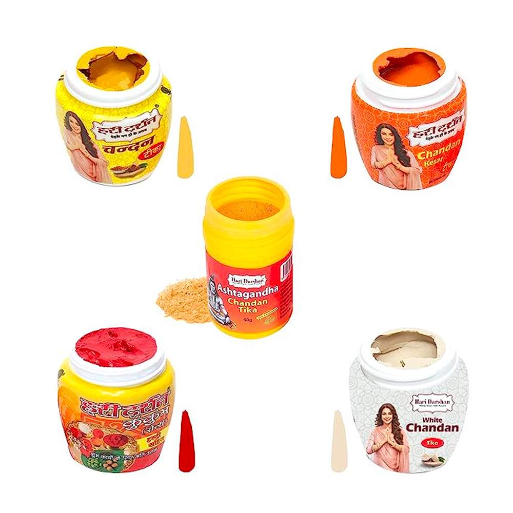 Tika Combo - Sandalwood, Chandan Kesar, Ashtagandha, Kumkum Roli, White Tika/Tilak - Pack of 5