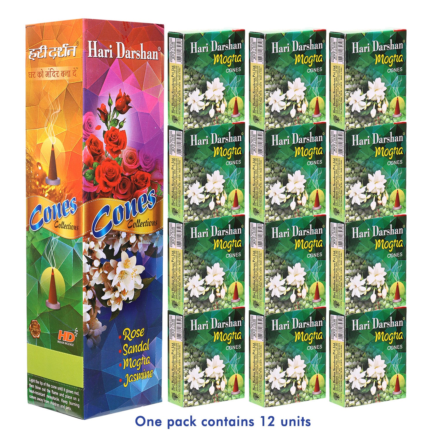 Combo of Dry Dhoop Cones - Mogra, Rose, Jasmine, Sandal - 3 Pack of Each Fragrance (20 Cones in Each Pack), Pack of 12