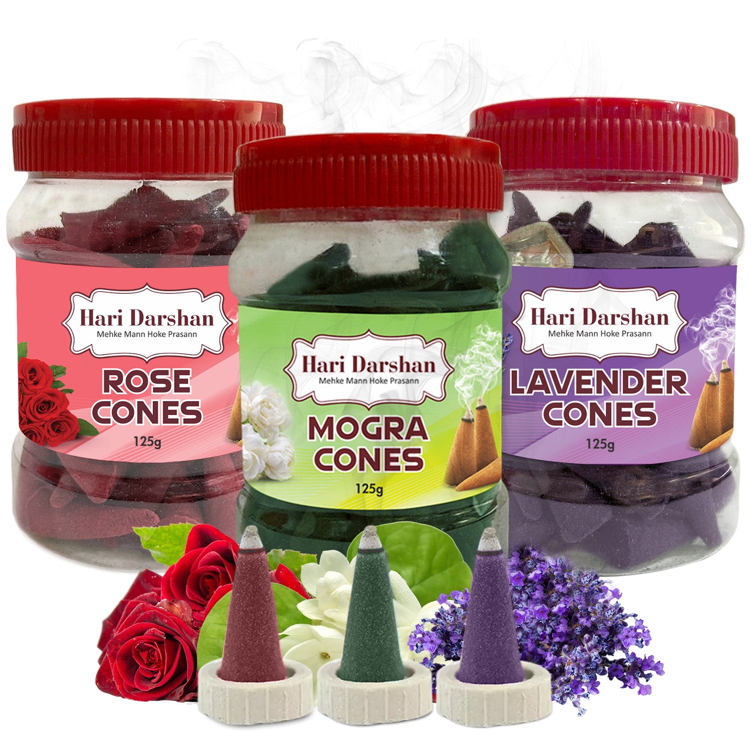 Combo of Rose, Mogra, Lavender - Dhoop Cones Jar - Pack of 3, 65 Pcs in Each Pack