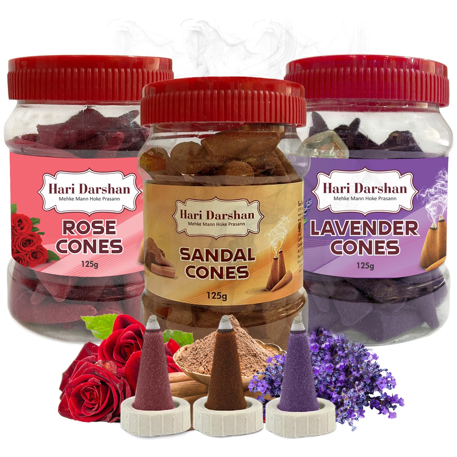 Combo of Lavender, Sandal, Rose - Dhoop Cones Jar - Pack of 3, 65 Pcs in Each Pack