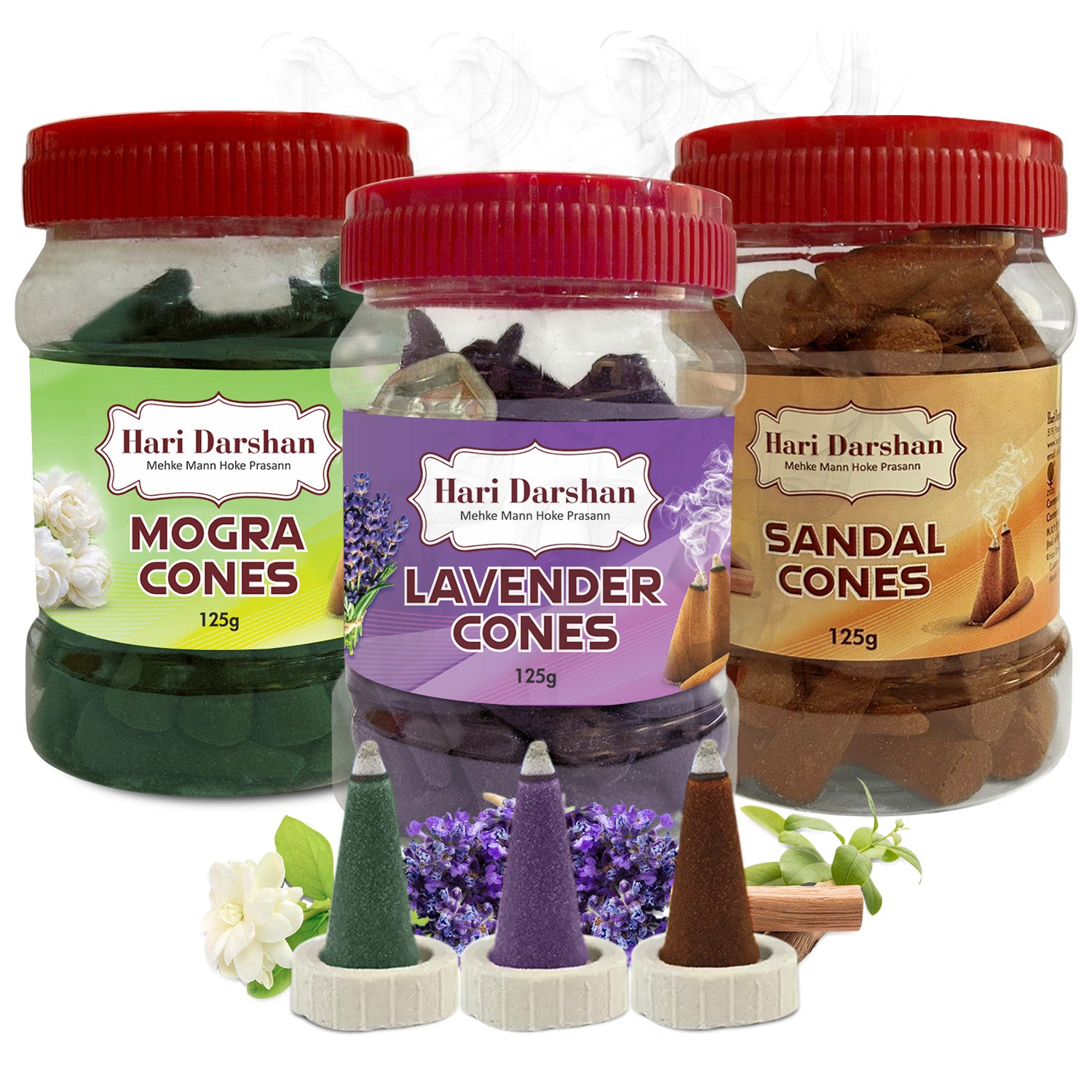 Combo of Lavender, Sandal, Mogra - Dhoop Cones Jar - Pack of 3, 65 Pcs in Each Pack