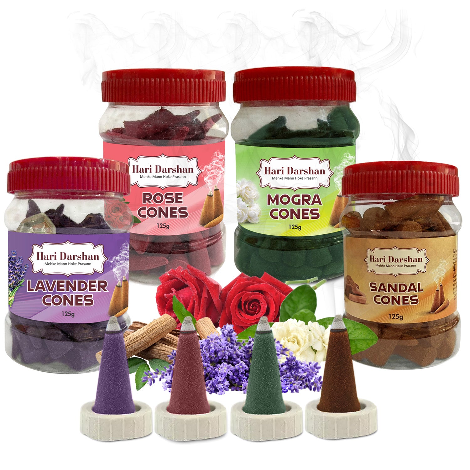 Mix Dhoop Cones - Rose, Mogra, Lavender & Sandal - 120 Cones in Each Jar