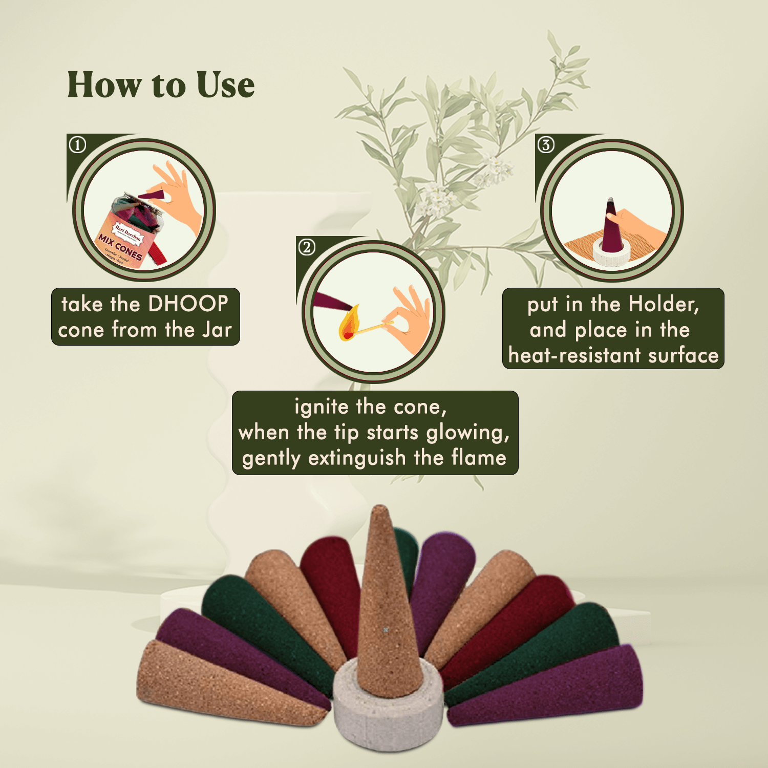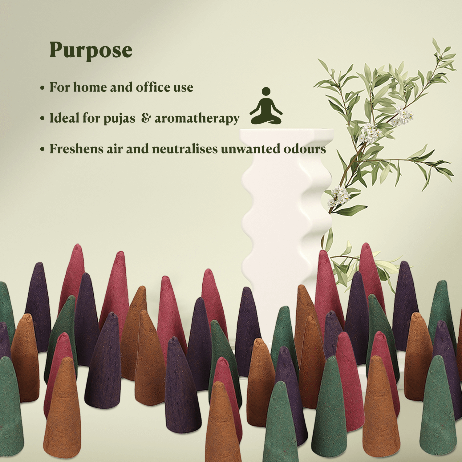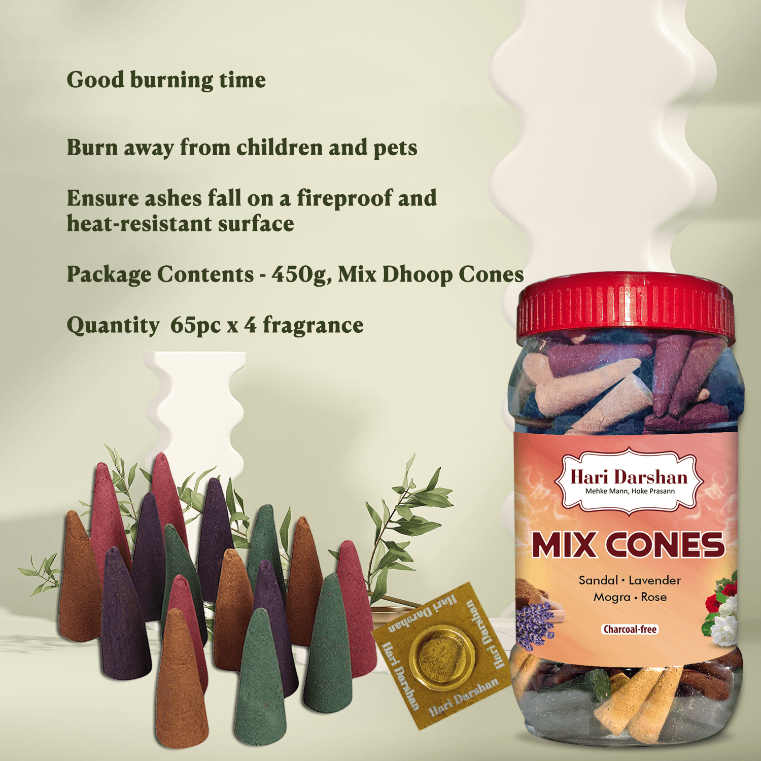 Enjoy the harmonious blend of Rose, Mogra, Lavender & Sandal fragrances in our Mix Dhoop cones. - Charcoal Free - 450G
